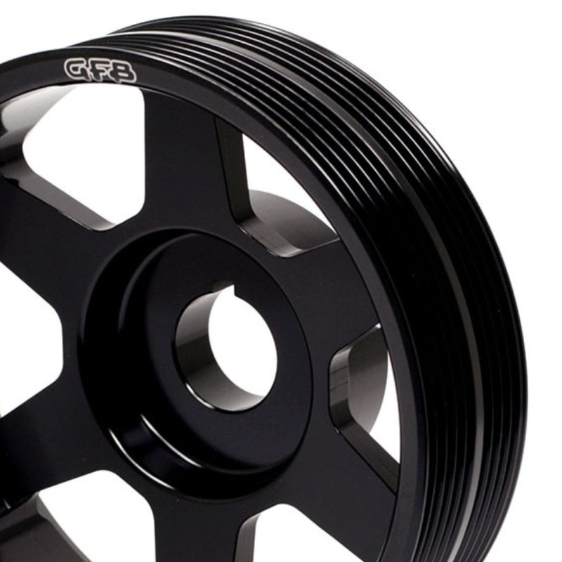 It might be hard to imagine how reducing the mass of a pulley makes a car go faster, but accelerating a heavy factory pulley from say 3000-7000 RPM in a second or two saps a measurable amount of torque. GFB Lightweight Pulleys reduce inertia by up to 85 percent, so most of the torque that used to accelerate the pulley can now be applied to the wheels.