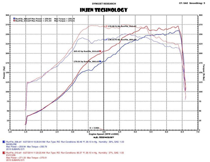 Roto-molded Housing and Ram Air Scoop: The EVO1206 system features our 2-piece box design that incorporates our boost plenum. The box attaches to our fully incorporated ram air scoop to capture the maximum amount of cool air to feed that hungry turbo. , , 6061 Aluminum Intake Tube: The EVO1206 Evolution Air Intake System uses a custom designed and dyno-tuned, aluminum intake tube that utilizes our patented air fusion and MR technology to produce huge power gains while retaining an OE quality fit and safe fuel trim levels., , SuperNano-Web Dry Air Filter: "That?s massive!" is all you will hear about this SuperNano-Web Dry air filter that is included with the EVO1206 cold air intake system. This filter has been uniquely designed to work with the downward facing orientation to ensure a leak-proof seal. Using the largest filter possible for this application has increased the available air volume - resulting in added power while keeping the installation process quick and simple. , , Quality Hardware: From the Stainless Steel Band Clamps with an inner protective liner to the reinforced automotive grade silicone coupler, every aspect is covered for a perfect and secure fit. , , Hassle-Free Installation: Make it easy! By designing this kit in a 3D workspace, you?re ensured a quick and easy installation that not only increases the power output of your engine, but also provides a clean and powerful look that others see every time you pop your hood., , Dyno Proven: Clean and simple, NUMBERS talk! Injen has put in the time and diligence to stand behind our performance data. We put in the time to test and prove that we have developed a superior kit for your Subaru. After hours of designing and dyno teWRX STIng, Injen is proud to say that the EVO1206 Evolution Air Intake system puts down numbers of up to 26 additional horsepower and 34 Ft.-lbs. of torque.