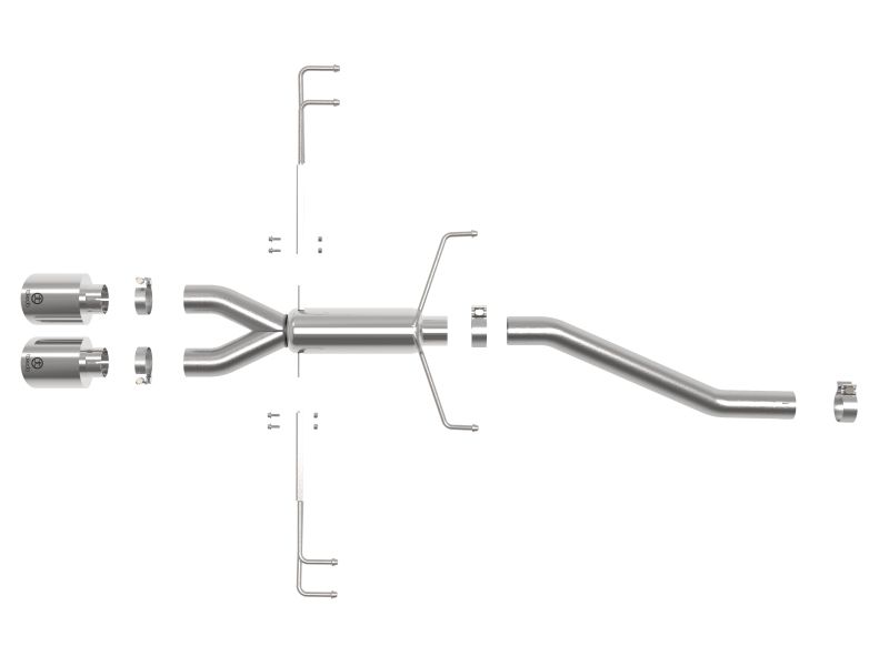 2-1/2" 304 Stainless Steel Construction: This axle-back exhaust system is constructed of 2-1/2" mandrel-bent 304 stainless steel tubing for maximum strength and durability.Dual 4-1/2" Diameter Polished Exhaust Tips: Finishing off this exhaust system are dual 4-1/2" diameter polished 304 stainless steel clamp-on exhaust tips. The tips features a laser etched Takeda logo for a unique style.Installation: Requires cutting factory exhaust. Utilizing factory style hangers this system mounts directly to factory mounting locations for a hassle-free installation.Integrated Mitered Merge Collector: A mitered merge collector is used to decrease turbulence and increase exhaust velocity resulting in increased horsepower, torque and improved throttle response.Computer-Aided Design: Utilizing state-of-the-art computer-aided design technology, this exhaust system is designed for custom, high tolerance factory fitment.MIG-Welded: 100% MIG-Welded for race-proven strength and durability.Note: Some cutting is required, see instruction sheet for further information.Emissions Disclaimer: This product does not require a CARB EO#.aFe POWER exhaust systems are engineered and manufactured in our Corona, California facility.