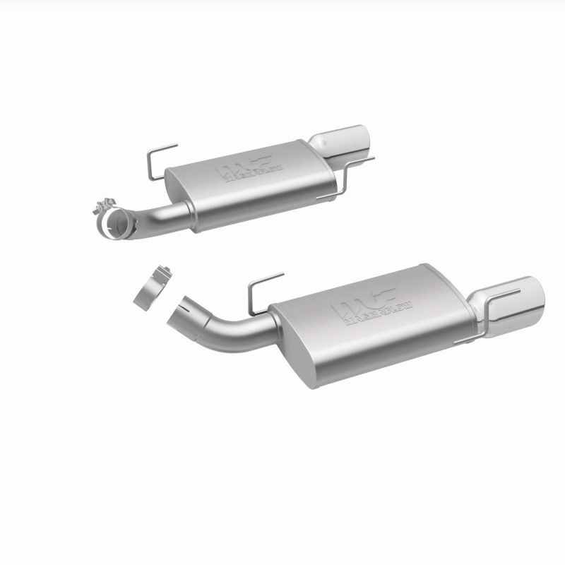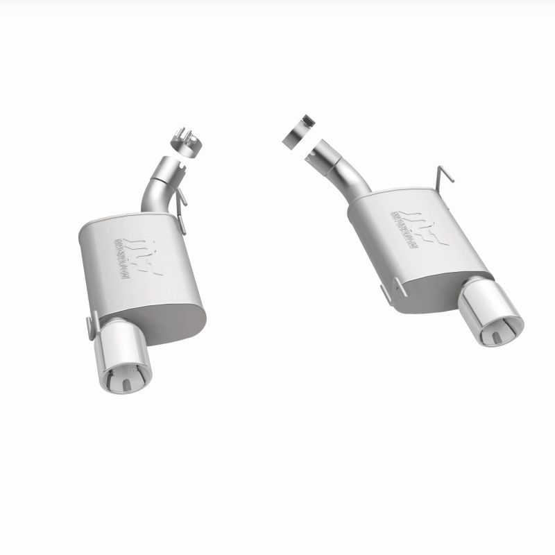 The MagnaFlow Ford Mustang Street Series 15882 brings enhanced engine sound and dyno-proven performance to your 4.6L, 5.4L 2005-2009 Ford Mustang with a healthy helping of our deep, resonant signature exhaust note at Moderate exterior and Mild interior sound levels. Thanks to its durable, corrosion resistant stainless steel design, this Ford Mustang exhaust system will handle whatever tarmac you decide to leave your mark on. This performance exhaust kit features an axle-back layout designed to replace your Ford Mustang’s exhaust system from near the rear axle on back. With its fast-flowing, mandrel bent 2.5in. main piping and 2 Straight-Through mufflers ending in a Dual Split Rear exit with 4in. Polished Welded-Double Wall-Angle Cut-Rolled Edge-Resonated tips, your ride will be sounding as awesome as it looks. Extensive 3D scanning during development has resulted in a direct-fit design that you can easily install yourself. 15882 is produced using CNC precision robotic manufacturing techniques and is backed by MagnaFlow’s 1-year limited finish warranty and limited lifetime construction warranty.