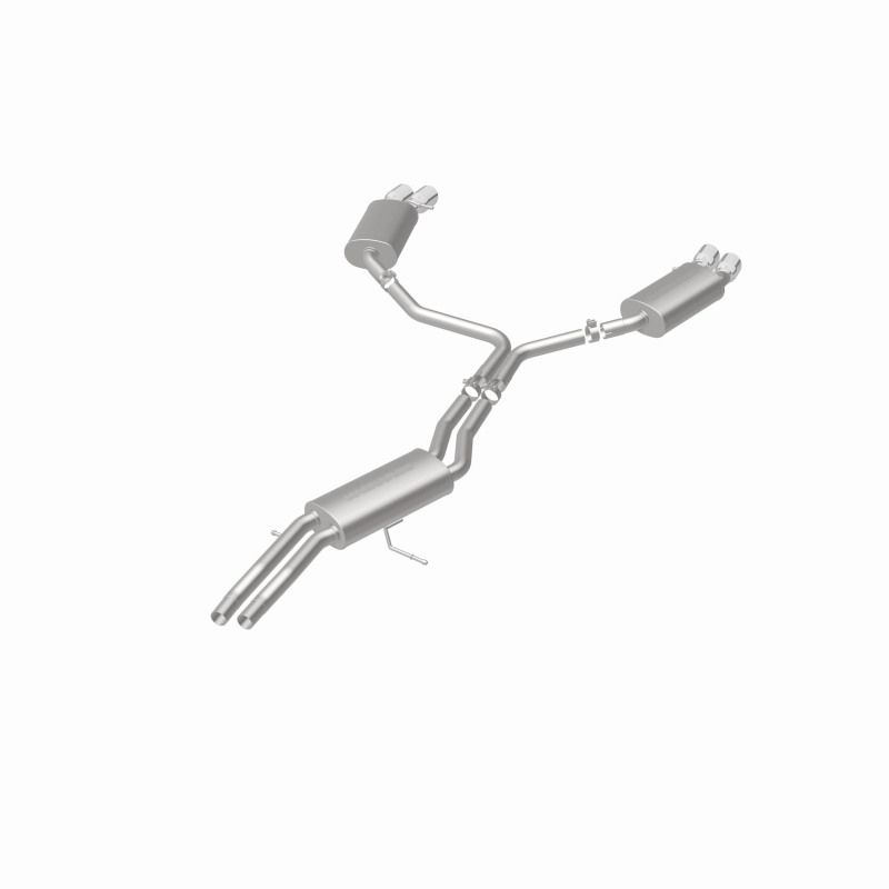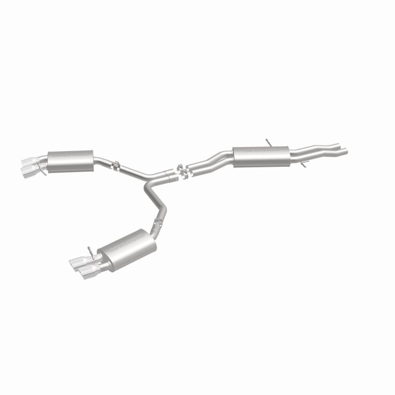 The MagnaFlow 2010-2016 Audi S4 Touring Series Cat-Back Performance Exhaust System 15599 is the perfect partner for your 3.0L 2010-2016 Audi S4 to take on a grand tour or a weekend cruise thanks to the powerful, resonant exhaust note and dyno-proven performance it brings to the table. This durable, corrosion resistant stainless steel exhaust kit is engineered to conquer the miles with ease while enhancing your driving experience with Moderate exterior and Mild interior sound levels generated through its fast-flowing, mandrel bent 2.25in. main piping and 3 Straight-Through muffler that terminate in a Quad Split Rear exit with 3.5in. Polished Welded-On Double Wall Angle Cut Folded Edge tips. 15599 features a cat-back layout design to replace your import's stock exhaust components from the catalytic converter on back. This Audi S4 exhaust system is compatible with 2010-2016 engines. The use of extensive 3D scans made during the development process has resulted in an easy-to-install, direct-fit design that fits your Audi S4 like a glove. 15599 is produced using CNC precision robotic manufacturing techniques and is backed by MagnaFlow's limited lifetime construction warranty.. Magnaflow Touring Series Stainless Cat-Back System.