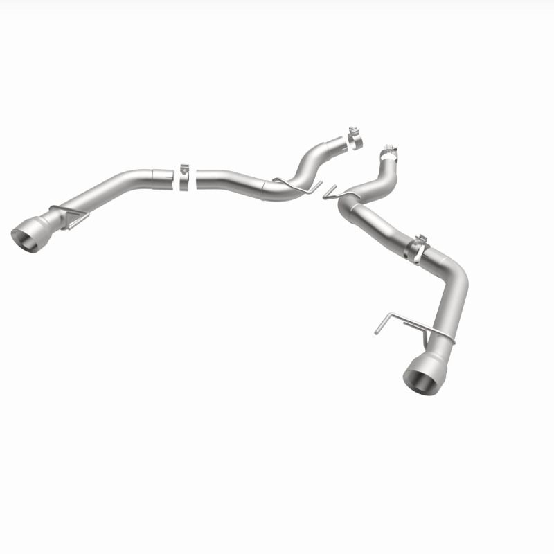 The MagnaFlow 2015-2017 Ford Mustang Race Series Axle-Back Performance Exhaust System 19344 doesn't leave any performance on the table with a race-ready, light weight, dyno-proven design ready to help your 5.0L 2015-2017 Ford Mustang take on any pretenders, whether on the track or the street. Exhaust kit 19344 is engineered to produce our powerful, resonant signature exhaust note at Very Aggressive exterior and Aggressive interior sound levels with an axle-back layout that replaces your vehicle's exhaust components from near the rear axle on back. Please check to ensure compliance with local noise regulations. This Ford Mustang exhaust kit features fast-flowing mandrel bent 3in. diameter main piping that ends in a Dual Split Rear exit with 4.5in. Polished Welded-On Double Wall Angle Cut Folded Edge tips. Extensive 3D scanning during development and the use of advanced CNC precision robotic manufacturing techniques ensures that 19344's direct-fit design fits so perfectly that you can easily install the system yourself. The durable, corrosion resistant stainless steel construction of exhaust system 19344 is backed by MagnaFlow's limited lifetime warranty.
