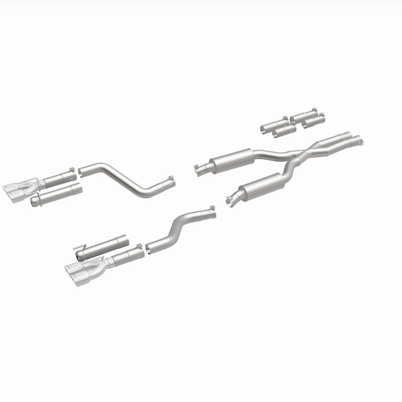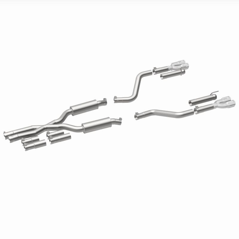 The MagnaFlow 2015-2023 Dodge Challenger Competition Series Cat-Back Performance Exhaust System brings an aggressive, attention-grabbing edge to the deep resonant exhaust note we're so well known for. This exhaust kit is designed to enhance your 5.7L, 6.2L, 6.4L 2015-2023 Dodge Challenger with dyno-proven performance made possible thanks to fast-flowing mandrel bent 3in. main piping and 2 Straight-Through mufflers ending in a Quad Split Rear exit with 3.5in. Polished Welded-On Double Wall Angle Cut Folded Edge tips featuring a sporty finish. The exhaust system's cat-back layout replaces your ride's exhaust system from near the catalytic converter on back. Exhaust system 19367 is engineered to make your vehicle's engine produce Aggressive exterior and Moderate interior sound levels, befitting its competition-oriented design. 19367's direct-fit design makes installation a breeze thanks to the use of advanced 3D scanning techniques. This performance exhaust system is made of 100% durable and corrosion-resistant stainless steel and produced using CNC precision robotic manufacturing, all backed by MagnaFlow's limited lifetime warranty. Please check to ensure compliance with local noise regulations.