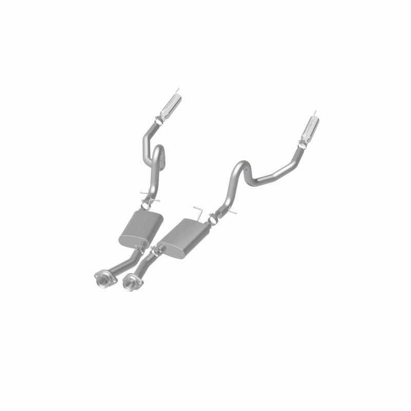 The MagnaFlow 1999-2004 Ford Mustang Street Series Cat-Back Performance Exhaust System 15671 brings out the personality of your 4.6L 1999-2004 Ford Mustang with our signature resonant, powerful engine tone and dyno-proven performance. Thanks to its fast-flowing, mandrel bent 2.5in. main piping and 2 Straight-Through mufflers ending in a Dual Split Rear exit with 3.5in. Polished Clamp-On Single Wall Angle Cut Cut Edge tips, this Ford Mustang exhaust kit has the performance chops to match its sporty sound and appearance. Upgrade your ride to the next level with an exhaust that has the pipes to put other Ford Mustang's to shame. With this system your vehicle will be producing Moderate exterior and Mild interior sound levels while leaving other cars and trucks feeling envious at every stoplight. Exhaust kit 15671 features a cat-back layout that replaces your ride's stock exhaust components from near the catalytic converter on back. Extensive 3D scanning during development has resulted in a direct-fit design that you can easily install yourself. 15671 is produced using CNC precision robotic manufacturing techniques and is backed by MagnaFlow's 1-year limited finish warranty and limited lifetime construction warranty.. Magnaflow Street Series Stainless Cat-Back System.