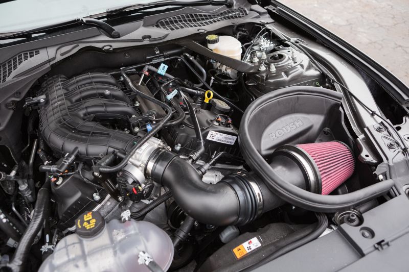 The all-new ROUSH Cold Air Kit is the perfect addition to any V6 Mustang. A more efficient air-intake than the stock air filter assembly, ROUSH?s cold air kits unlock latent power potential and fuel efficiency that would otherwise be restricted. Custom calibration is not required and a noticeable increase of 10.5 hp and 9 lb-ft of torque is possible. This high flow system has 20% less intake restriction compared to the stock induction system The kit includes an dry filter that retains its shape during high airflow and is made up of an inner and outer layer of wire mesh that ensures durability and support of the filtration media. You don?t? need to use messy oils to maintain this filter, just simply wash it and let it dry. Included in the kit is the air filter with clamp, injection-molded lower air box/tray with installed EPDM foam hood seal, Blow Molded clean air tubes and all required mounting hardware. The kit utilizes all factory emissions and vacuum lines. Factory mounting locations and hardware are utilized to allow for quick and easy installation.