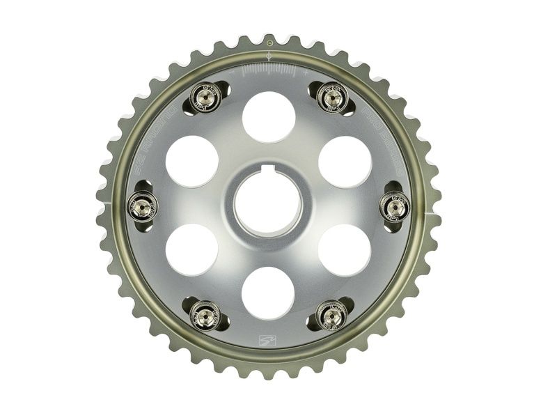 An engine's camshafts must be set at their proper positions relative to the crankshaft in order to maximize horsepower. Pro Series Cam Gears for Hondas H-series & F-Series VTEC engines enable serious tuners to optimize horsepower and torque by being able to adjust camshaft timing +/- 10 degrees, in one-degree increments, allowing them to tailor the power curve appropriately. Thanks to laser-etched timing and directional marks, precise camshaft adjustments can be made quickly and easily. Pro Series Cam Gears feature precision-machined, hard-anodized teeth to reduce premature wear with a signature, six-bolt design that eliminates gear slipping. Skunk2's lightweight design (35 percent lighter than OEM) and CNC-machined, 7075-T6 billet aluminum construction reduces rotational inertia, resulting in increased engine response and acceleration. Skunk2's adjustable cam gears have also been proven on race cars in the most extreme conditions for more than a decade.