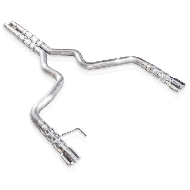 2015-16 Mustang GT 5.0L 304 stainless steel 3" catback dual-exhaust with H-pipe, retro chambered mufflers with 2.5" cores and mirror-polished tips. Includes hangers and clamps and is designed to mate to the factory connection point..