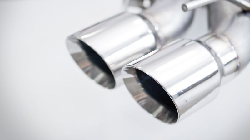 2016-19 Cadillac CTS-V Sedan exhaust system featuring 3" mandrel bent inlet bends into Turbo mufflers with 4" diameter quad slash cut tips. Requires cutting of tailpipes in front of factory mufflers to fit to factory exhaust system..