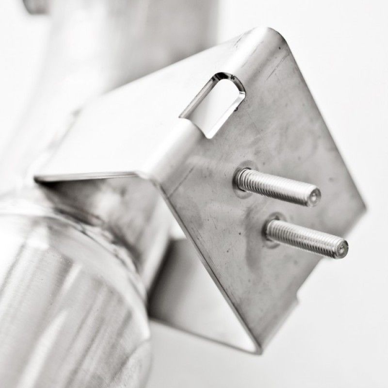 2013-18 Ford Focus ST 2.0L 3" catted downpipe. Includes hangers and flex joint. This 3" downpipe is fully 3" front to back with V-Band flange at the turbo and two bolt flange at the catback factory connection point. Works with OEM or Stainless Works catback (FC13CB-RT, FC13CB-WT)