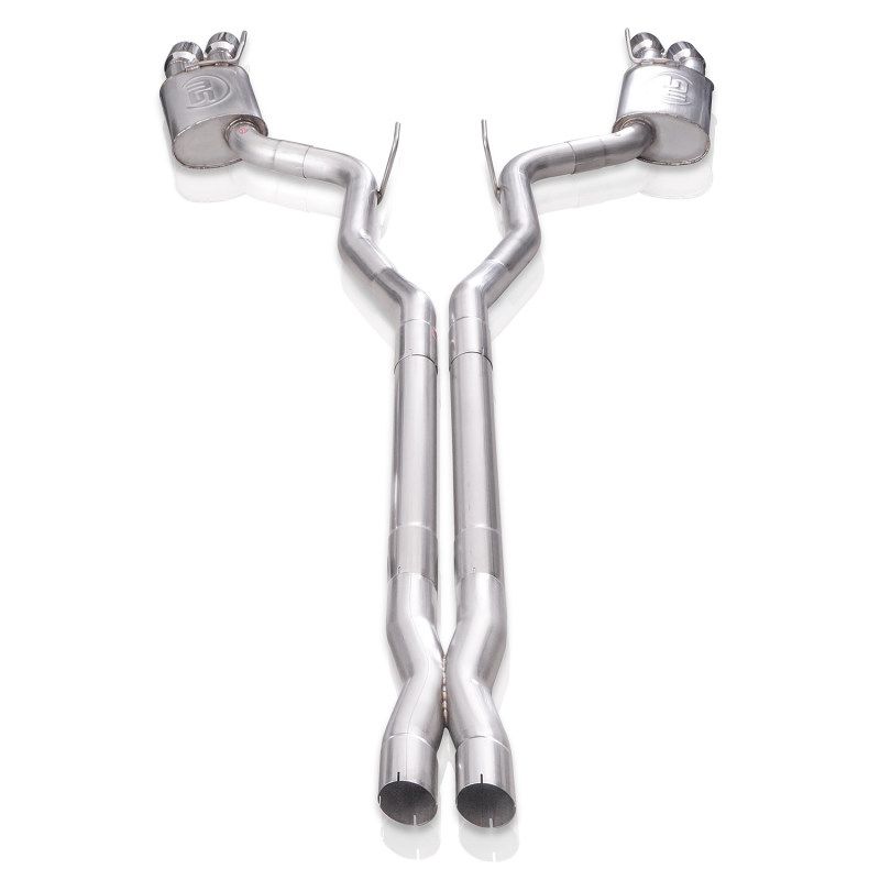 2018+ Mustang GT 5.0L, 3" Catback Dual Exhaust with X-pipe. Improve sound and performance on your Mustang GT with this Redline catback exhaust from Stainless Works. Redline series, designed to get the most aggressive sound out of your GT, we've designed these mufflers to maximize the volume and tone of that 5.0L V8 while still eliminating any drone in the cabin. All tubes are CNC mandrel bent for optimal flow. Made from 304 stainless steel for maximum corrosion resistance. This is a quad tip exhaust, exiting through our 4" slash cut conical double wall polished tips Includes hangers and clamps. This system has a performance connection that mates with Stainless Works headers. This system is designed for vehicles without Active Valve Performance Exhaust. Mill finish, All TIG welded for strength and durability. These kits come with a lifetime warranty and proudly made in the USA. This system is designed for standard vehicles without the valve. Not confirmed to fit convertibles.