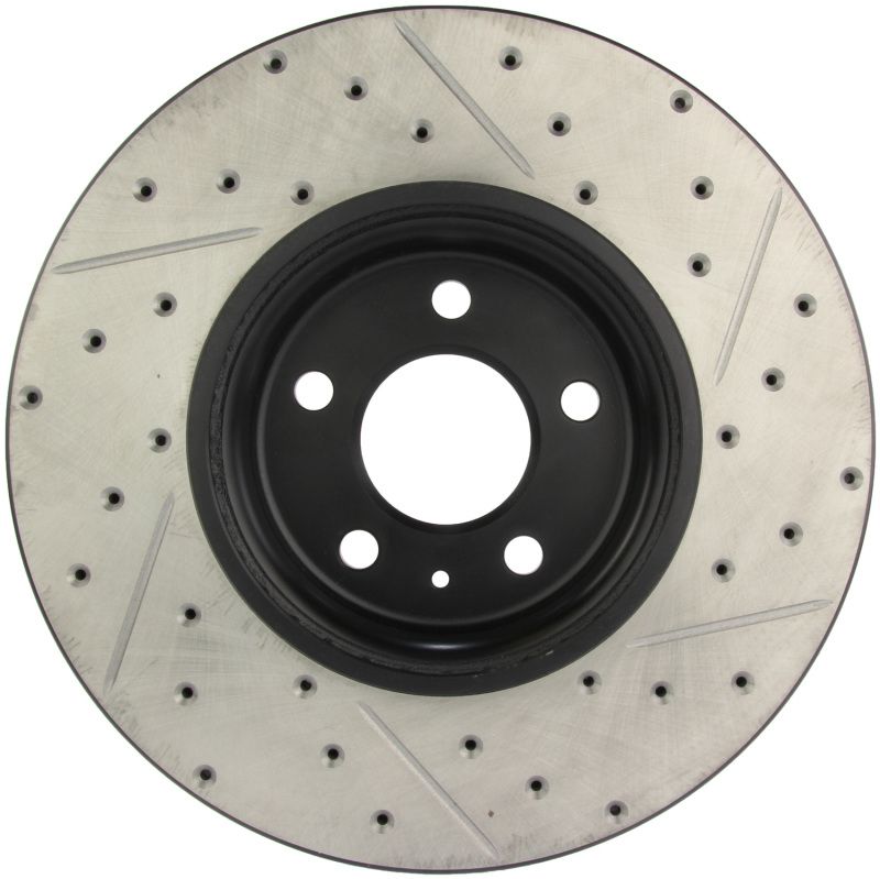 StopTech Drilled and Slotted Sport Rotors are 1-piece direct replacement brake discs for factory brake systems and stock calipers that look great behind your wheels - and offer significantly improved braking performance. The unique cross-drilling and slotting aids with heat and brake dust dispersal; prevents glazing of the pads; adds bite and improves wet and dry braking performance. Built to last; the painted hat provides protection from corrosion and the high carbon metallurgy (in most applications) offers quieter operation; better crack resistance and increased performance.