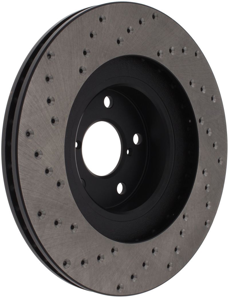 StopTech Drilled Sport Rotors are 1-piece direct replacement brake discs for factory brake systems and stock calipers that look great behind your wheels - and offer significantly improved braking performance. The unique cross-drilling aids with heat and brake dust dispersal; prevents glazing of the pads; adds bite and improves wet and dry braking performance. Built to last; the black paint provides protection from corrosion and the high carbon metallurgy (in most applications) offers quieter operation; better crack resistance and increased performance.