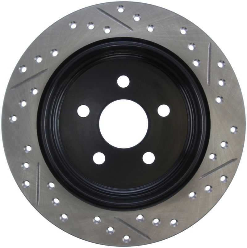 StopTech Drilled and Slotted Sport Rotors are 1-piece direct replacement brake discs for factory brake systems and stock calipers that look great behind your wheels – and offer significantly improved braking performance. The unique cross-drilling and slotting aids with heat and brake dust dispersal; prevents glazing of the pads; adds bite and improves wet and dry braking performance. Built to last; the black e-coating provides protection from corrosion and the high carbon metallurgy (in most applications) offers quieter operation; better crack resistance and increased performance.