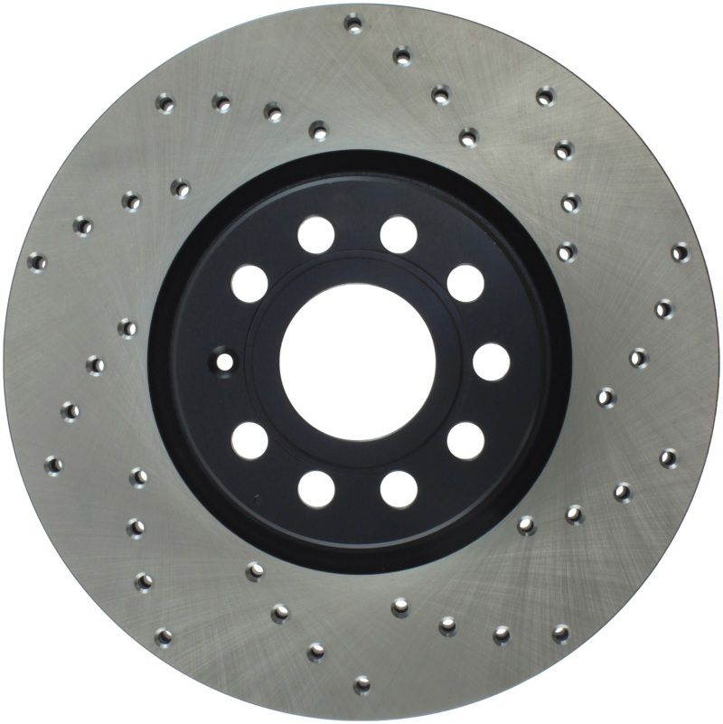 StopTech Drilled Sport Rotors are 1-piece direct replacement brake discs for factory brake systems and stock calipers that look great behind your wheels - and offer significantly improved braking performance. The unique cross-drilling aids with heat and brake dust dispersal; prevents glazing of the pads; adds bite and improves wet and dry braking performance. Built to last; the black paint provides protection from corrosion and the high carbon metallurgy (in most applications) offers quieter operation; better crack resistance and increased performance.
