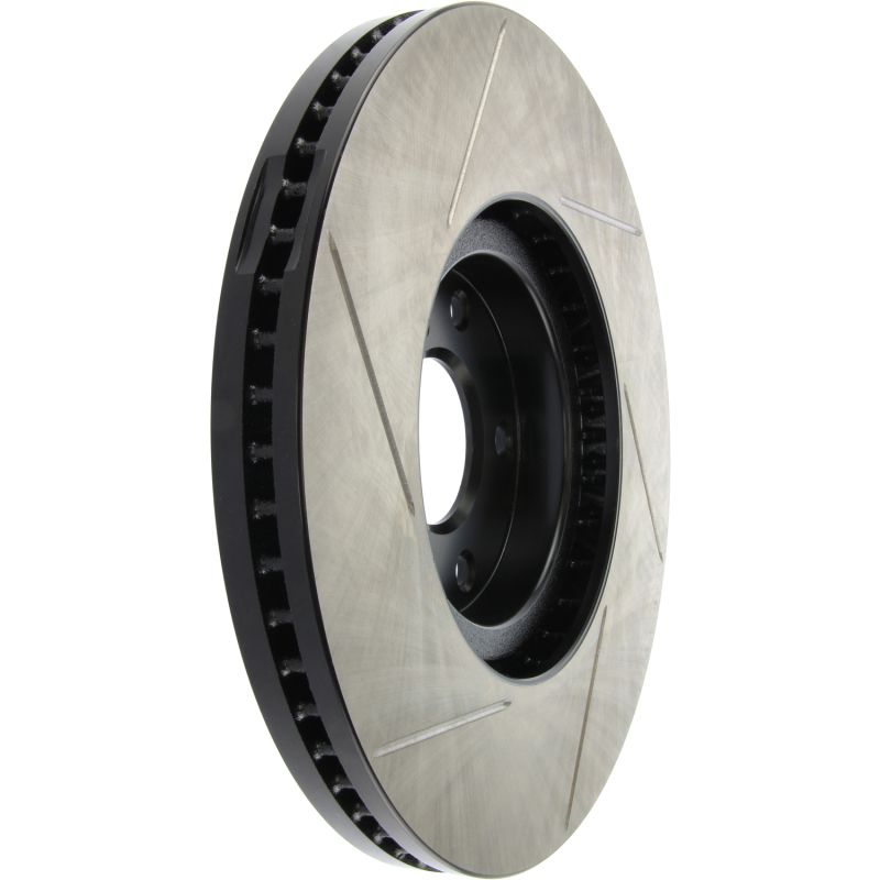 StopTech Slotted Sport Rotors are 1-piece direct replacement brake discs for factory brake systems and stock calipers that look great behind your wheels - and offer significantly improved braking performance. The unique slotting aids with heat and brake dust dispersal; prevents glazing of the pads; adds bite and improves wet and dry braking performance. Built to last; the black paint provides protection from corrosion and the high carbon metallurgy (in most applications) offers quieter operation; better crack resistance and increased performance.