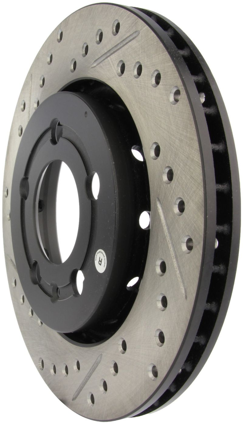StopTech Drilled and Slotted Sport Rotors are 1-piece direct replacement brake discs for factory brake systems and stock calipers that look great behind your wheels - and offer significantly improved braking performance. The unique cross-drilling and slotting aids with heat and brake dust dispersal; prevents glazing of the pads; adds bite and improves wet and dry braking performance. Built to last; the painted hat provides protection from corrosion and the high carbon metallurgy (in most applications) offers quieter operation; better crack resistance and increased performance.