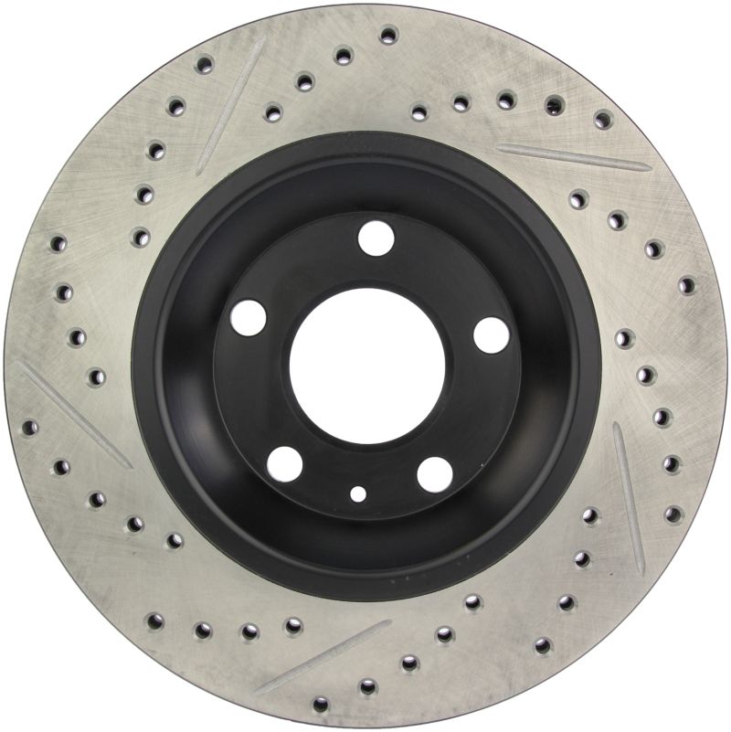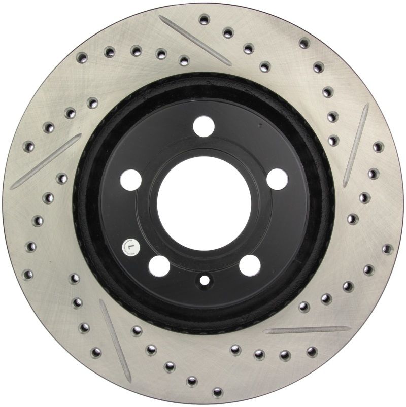 StopTech Drilled and Slotted Sport Rotors are 1-piece direct replacement brake discs for factory brake systems and stock calipers that look great behind your wheels - and offer significantly improved braking performance. The unique cross-drilling and slotting aids with heat and brake dust dispersal; prevents glazing of the pads; adds bite and improves wet and dry braking performance. Built to last; the painted hat provides protection from corrosion and the high carbon metallurgy (in most applications) offers quieter operation; better crack resistance and increased performance.