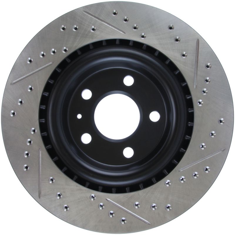 StopTech Drilled and Slotted Sport Rotors are 1-piece direct replacement brake discs for factory brake systems and stock calipers that look great behind your wheels – and offer significantly improved braking performance. The unique cross-drilling and slotting aids with heat and brake dust dispersal; prevents glazing of the pads; adds bite and improves wet and dry braking performance. Built to last; the black e-coating provides protection from corrosion and the high carbon metallurgy (in most applications) offers quieter operation; better crack resistance and increased performance.