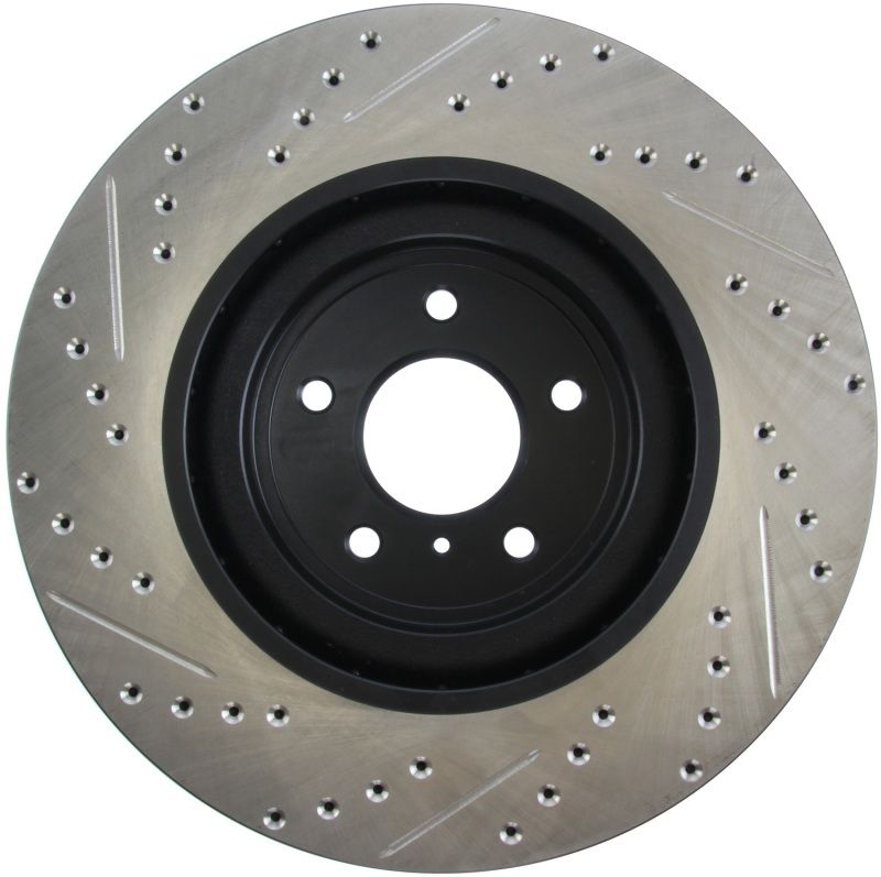 StopTech Drilled and Slotted Sport Rotors are 1-piece direct replacement brake discs for factory brake systems and stock calipers that look great behind your wheels - and offer significantly improved braking performance. The unique cross-drilling and slotting aids with heat and brake dust dispersal; prevents glazing of the pads; adds bite and improves wet and dry braking performance. Built to last; the painted hat provides protection from corrosion and the high carbon metallurgy (in most applications) offers quieter operation; better crack resistance and increased performance.