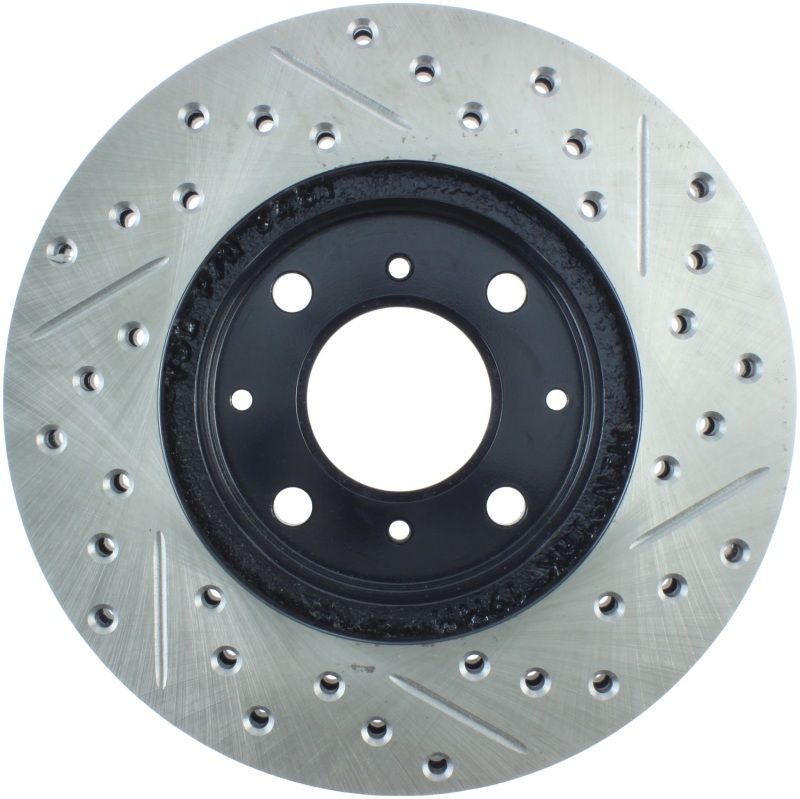 StopTech Drilled and Slotted Sport Rotors are 1-piece direct replacement brake discs for factory brake systems and stock calipers that look great behind your wheels - and offer significantly improved braking performance. The unique cross-drilling and slotting aids with heat and brake dust dispersal; prevents glazing of the pads; adds bite and improves wet and dry braking performance. Built to last; the painted hat provides protection from corrosion and the high carbon metallurgy (in most applications) offers quieter operation; better crack resistance and increased performance.