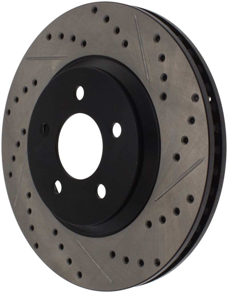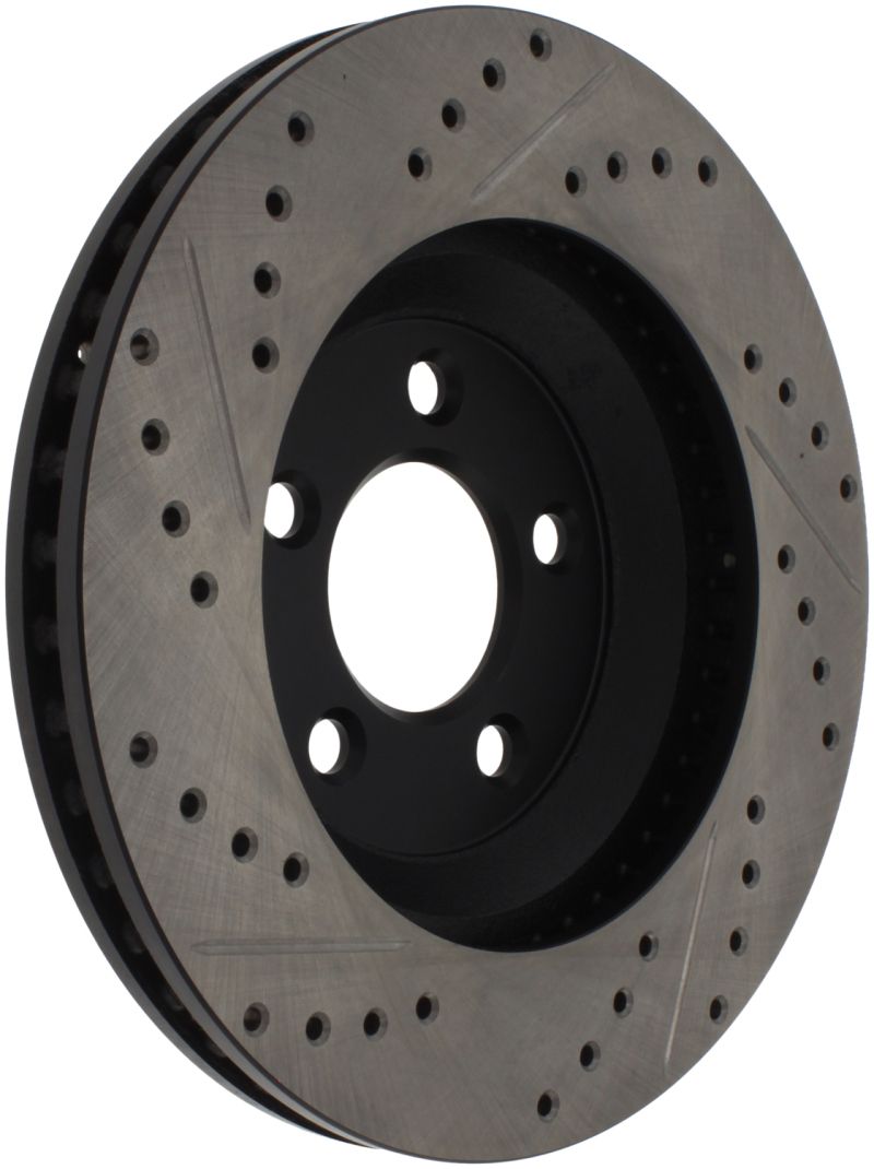 StopTech Drilled and Slotted Sport Rotors are 1-piece direct replacement brake discs for factory brake systems and stock calipers that look great behind your wheels – and offer significantly improved braking performance. The unique cross-drilling and slotting aids with heat and brake dust dispersal; prevents glazing of the pads; adds bite and improves wet and dry braking performance. Built to last; the black e-coating provides protection from corrosion and the high carbon metallurgy (in most applications) offers quieter operation; better crack resistance and increased performance.