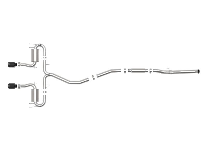 Performance Gains: This system produced gains of up to +6 HP and +5 lbs. x Ft. TQ., as measured on our in-house dyno. 3" - 2-1/2" 304 Stainless Steel Construction: This cat-back exhaust system is constructed of 3" - 2-1/2" mandrel-bent, brushed finished 304 stainless steel tubing for maximum strength and durability. High-Flow 304 Stainless Steel Polished Mufflers: This system features high-flow 304 stainless steel polished mufflers, producing a smooth sound. The mufflers has a polished finish for ultimate corrosion resistance. Dual 4-1/2" Diameter Black Exhaust Tips: Finishing off this exhaust system are dual 4-1/2" diameter black 304 stainless steel clamp-on exhaust tips. The tips features a laser etched Takeda logo for a unique style. Installation: Utilizing a factory style flange and hangers this system is a direct bolt-on system, which requires no cutting or modifications for a hassle-free installation. Integrated Mitered Merge Collector: A mitered merge collector is used to decrease turbulence and increase exhaust velocity resulting in increased horsepower, torque and improved throttle response. Computer-Aided Design: Utilizing state-of-the-art computer-aided design technology, this exhaust system is designed for custom, high tolerance factory fitment. TIG-Welded: 100% TIG-Welded for race-proven strength and durability. Emissions Disclaimer: This product does not require a CARB EO#. aFe POWER exhaust systems are engineered and manufactured in our Corona, California facility.