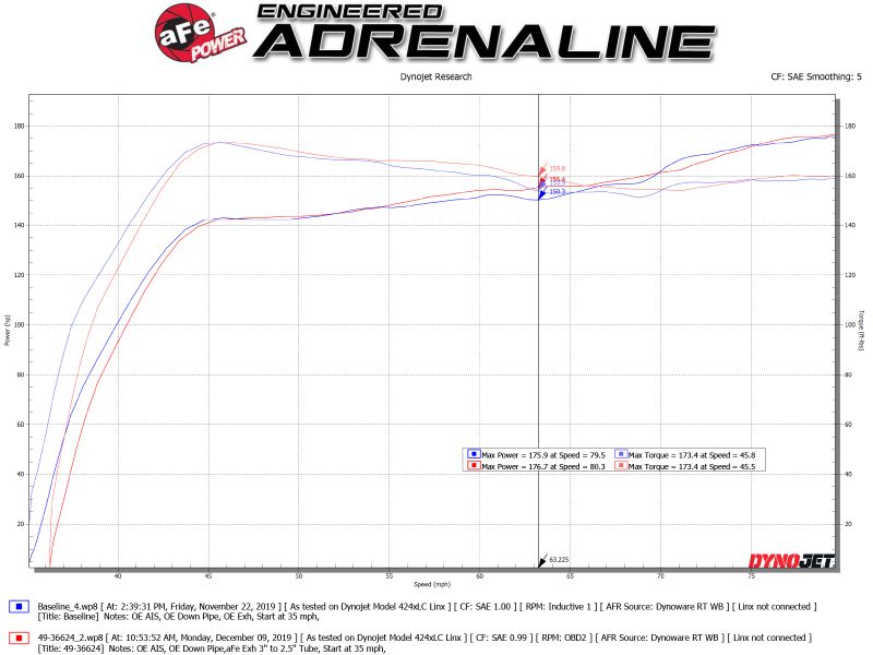 Performance Gains: This system produced gains of up to +6 HP and +5 lbs. x Ft. TQ., as measured on our in-house dyno.3" - 2-1/2" 304 Stainless Steel Construction: This cat-back exhaust system is constructed of 3" - 2-1/2" mandrel-bent, brushed finished 304 stainless steel tubing for maximum strength and durability.High-Flow 304 Stainless Steel Polished Mufflers: This system features high-flow 304 stainless steel polished mufflers, producing a smooth sound. The mufflers has a polished finish for ultimate corrosion resistance.Dual 4-1/2" Diameter Black Exhaust Tips: Finishing off this exhaust system are dual 4-1/2" diameter black 304 stainless steel clamp-on exhaust tips. The tips features a laser etched Takeda logo for a unique style.Installation: Utilizing a factory style flange and hangers this system is a direct bolt-on system, which requires no cutting or modifications for a hassle-free installation.Integrated Mitered Merge Collector: A mitered merge collector is used to decrease turbulence and increase exhaust velocity resulting in increased horsepower, torque and improved throttle response.Computer-Aided Design: Utilizing state-of-the-art computer-aided design technology, this exhaust system is designed for custom, high tolerance factory fitment.TIG-Welded: 100% TIG-Welded for race-proven strength and durability.Emissions Disclaimer: This product does not require a CARB EO#.aFe POWER exhaust systems are engineered and manufactured in our Corona, California facility.