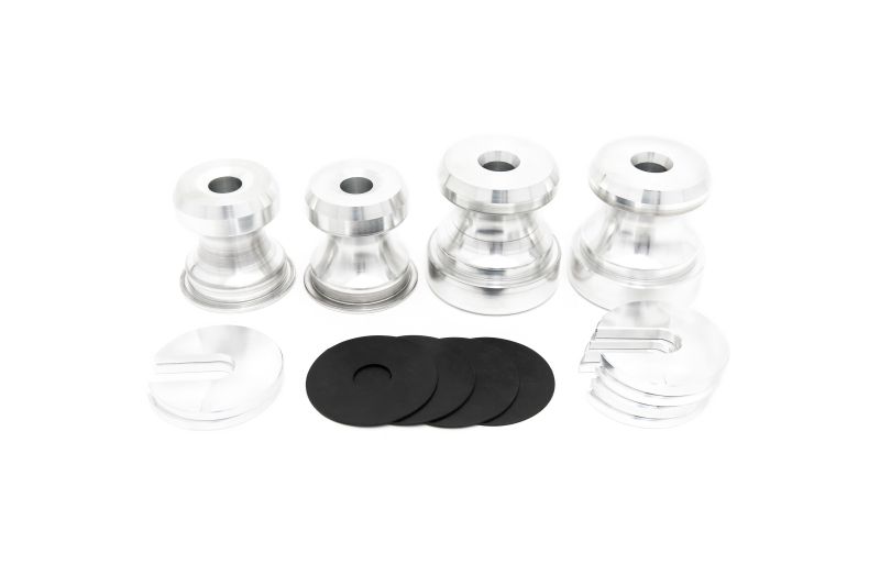 370Z/G37 SOLID Series Aluminum Subframe Bushings (SSB) replace the stock mushy rubber bushings on your Nissan 370Z to eliminate free play of the sub-frame relative to the chassis. This prevents the subframe from "bouncing around" under drive-train torque or suspension load, maintaining optimum suspension geometry and reducing wheel hop. Our slide-in shim system allows you to quickly raise or lower the subframe to fine-tune the roll center/anti-squat behavior to your preference. Raising the subframe will compensate roll center for a lowered car at the expense of increasing anti-squat. Lowering the subframe will decrease anti-squat at the expense of roll center. Now Formula Drift Regulation Compliant! With the recent regulation change in Formula D, we changed our kits to comply. You can maintain OEM height and be perfectly legal.Our SPL Parts SOLID Series Bushings are precision CNC machined from Billet 6061-T6 Aluminum for an accurate fit. This kit also includes optional rubber isolation washers to reduce noise transfer from the subframe to the chassis. Sold as a set.Made in the USA. Applications: Infiniti G35 (V36) Infiniti G37 (V36) Nissan 370Z (Z34) Installation Instructions: SPL Solid Subframe Bushings
