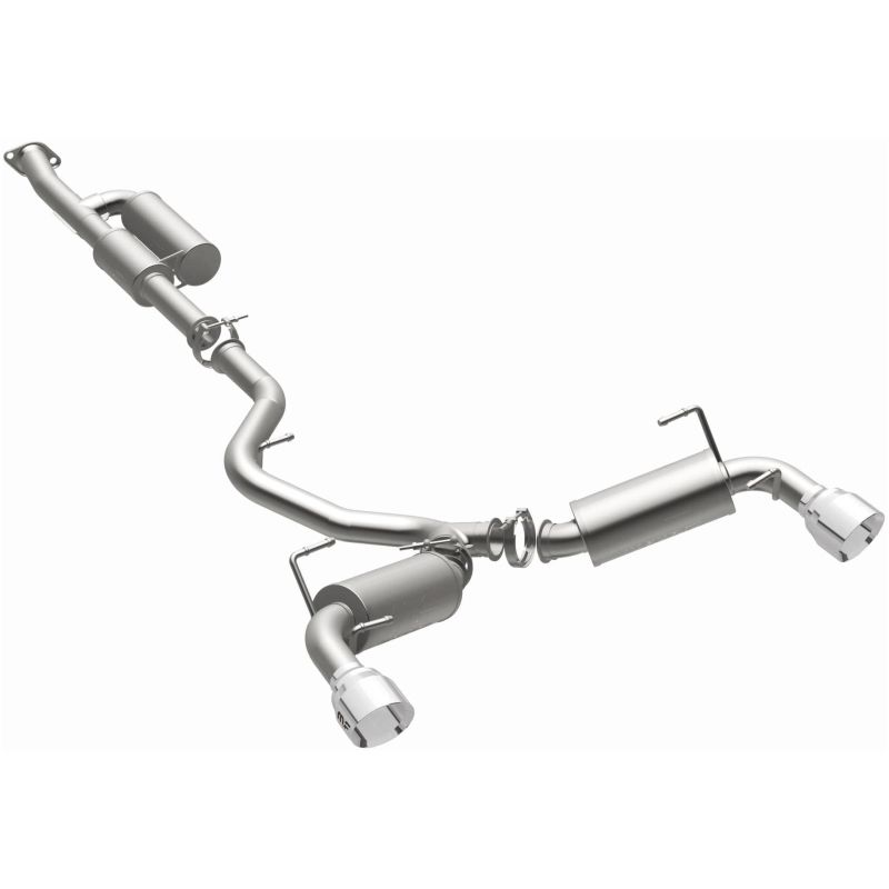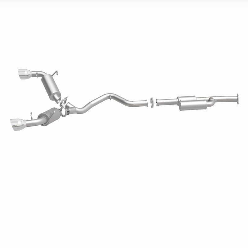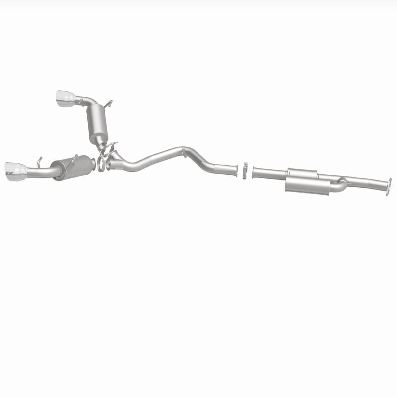 The MagnaFlow Toyota 86/Toyota GR86/Subaru BRZ/Scion FR-S NEO Series Performance Exhaust System #19595 brings dyno-proven performance and our latest exhaust advancements to your Japanese sportscar with an aggressive exterior sound and well-controlled, moderate interior sound made possible by careful integration of our No Drone Technology (NDT). By utilizing NDT in its design, exhaust kit #19595 is able to minimize the unwanted droning noise that can otherwise occur at cruising speeds. Exhaust system #19595 is compatible with 2022-2023 Toyota GR86s, 2013-2023 Subaru BRZs, 2017-2020 Toyota 86s and 2013-2016 Scion FR-Ss. This GR86/BRZ/86/FR-S exhaust system features 2.5" fast-flowing mandrel bent main piping that flows through a straight-through muffler and NDT resonator before terminating in a dual rear exit with 4.5" polished tips. The direct-fit design enables do-it-yourself installation and can be easily removed thanks to the use of racing-bred V-band clamps. #19595 is made of premium, durable and corrosion resistant stainless steel and is produced used CNC precision robotic manufacturing techniques, all backed by MagnaFlow's limited lifetime warranty.. Magnaflow NEO Series Stainless Cat-Back System.