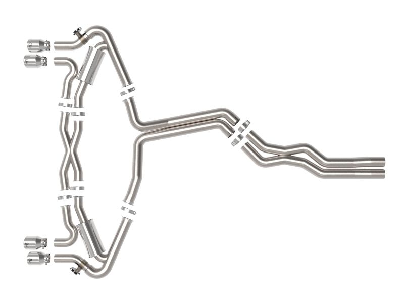This cat-back exhaust system is constructed of 3 IN - 2-1/2 IN mandrel-bent brushed finished 304 stainless steel tubing for maximum strength and durability. This system features high-flow 304 stainless steel mufflers, producing a deep sound. Finishing off this exhaust system are quad 3-1/2 IN diameter polished 304 stainless steel clamp-on exhaust tips. The tips features a laser etched aFe POWER logo for a unique style. This system produces a deep sound unleashing all available horsepower and torque. Utilizing a factory style flange and hangers this system is a direct bolt-on system, which requires no cutting or modifications for a hassle-free installation. This cat-back exhaust system uses a heavy duty flex pipe with an internal interlock liner for added strength and durability. A mitered merge x-pipe is used to balance and evenly distribute exhaust pulses traveling through the exhaust system, minimizing exhaust drone and maximizing scavenging. This system incorporates factory style exhaust valves which use the factory exhaust valve motors (not included). The valves help regulate, direct and control the flow of exhaust gases by opening, closing, or partially obstructing passageways depending on throttle position for maximum performance. State-of-the-art computer-aided design technology is utilized for precise vehicle fitment. 100% TIG-Welded for race-proven strength and durability.