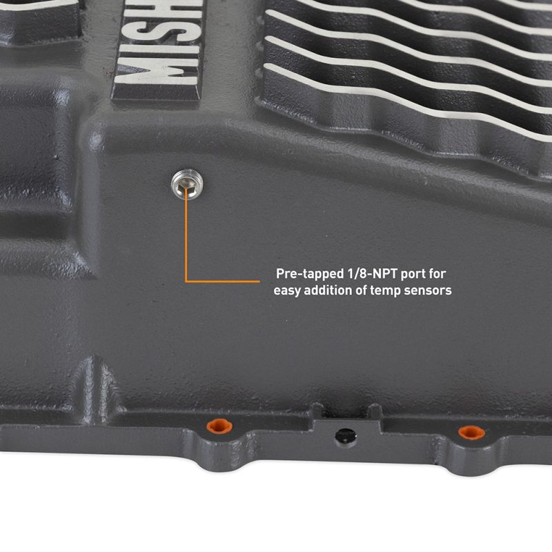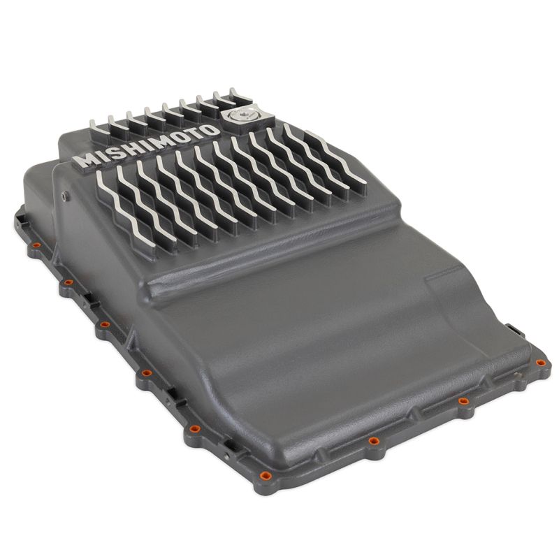 This Mishimoto Aluminum Transmission Pan is a direct-fit, high-performance upgrade for your Ford 10R60/10R80 transmission in your Bronco, Ranger, F-150, or Mustang. Cast from high-quality aluminum and powder coated Gunmetal Gray, our transmission pan is a robust and long-lasting upgrade for your vehicle's transmission. With a sleek design and bottom ribs, this pan not only adds to the overall aesthetic of your vehicle but also provides improved cooling performance.----This transmission pan features internal baffles that reduce sloshing and enhance heat dissipation, resulting in smoother transmission performance. All the headaches that come with a flat gasket and messy sealants are eliminated with our precision-machined dovetail-style groove and O-ring seal. This groove positively retains the O-ring, so you never have to worry about it falling out of place during installation. Additionally, the Mishimoto Ford 10R60/10R80 Aluminum Transmission Pan adds an extra 2 quarts of ATF to help maintain optimal transmission operation.----Fed up with the frustration of trying to hold up a transmission pan with one hand while threading the fasteners in with the other? Mishimoto has you covered with pre-installed bolt retainers that hold the fasteners in the pan, allowing you to easily thread the bolts without dropping them on the ground, your head, or worse, that pan of nasty transmission fluid you just drained. Additionally, our pan comes equipped with a magnetic drain plug for easy draining and a 1/8-inch NPT port and plug for temperature sensors to make servicing your transmission and monitoring temperatures a breeze.----This direct-fit upgrade offers affordable durability and helps maintain smooth transmission operation, ensuring a long life for your transmission. Like all Mishimoto products, this transmission pan is backed by the Mishimoto Lifetime Warranty.