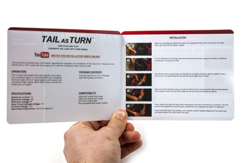 FeaturesConverts your tail light to also function as the turn signal.OEM tail light connectors for simple plug-and-play installation.Assembled in USA.OverviewCustom Appearance. This kit is compatible with Infiniti G37 Coupe/Q60 2008-2013 and will convert the LED tail light to also function as the turn signal. This kit will instantly customize your vehicle for a much more modern appearance on the road! This module does not include the option to convert your old turn signal location into additional backup lights.Easy Installation. Using OEM tail light connectors the base kit is 100% plug-and-play and installs in minutes with no wiring required. You don't even have to remove your tail lights!Experience. After over a decade in business Diode Dynamics is the most trusted name in automotive LED lighting. Unlike every other LED distributor we assemble and engineer products ourselves in the United States for high quality and fast time-to-market of the newest and brightest LED technologies. We pride ourselves in offering only quality LED products that will exceed your expectations. Please contact us if you'd like to discuss your lighting project!What's IncludedTwo (2) modules compatible with Infiniti G37 Coupe/Q60 2008-2013One (1) Installation Guide
