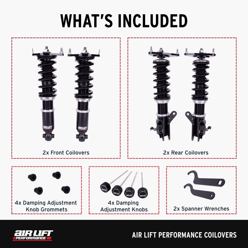 Built for enthusiasts, backed by legacy. Air Lift Performance Coilovers deliver superior quality, an aggressive stance, and a sporty ride you can trust. Get a lowered stance while still experiencing the best quality, designed for durability and performance. Our coilovers are the perfect solution for getting a static setup with a lowered stance, without the need for air adjustability, but are still comfortable for daily driving. Each kit is engineered with vehicle-specific mounts for an accurate bolt-on installation. As well as vehicle-specific valving and internal pressure, delivering a balance of comfort and performance tailored to your setup. Air Lift Performance Coilovers are equipped with 32-way damping adjustment, monotube dampers, anodized aluminum damper bodies, top mounts, locking collars and spring perches, vehicle-specific upper and lower mounts for a bolt-on installation, and vehicle-specific valving. With the ability to convert to a complete air suspension system via a coilover-to-air conversion kit available April 2, 2025, you can enjoy your new static stance or convert to air when you're ready and lay your ride on the ground. We love the performance vehicle world and wanted to bring more into the Air Lift community. We can now support the lowered car community with air suspension and coilover options.
