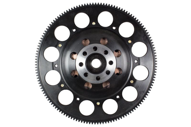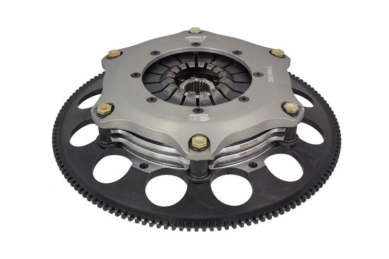T1RR-D02 race, twin disc kits are race-ready for the serious enthusiast who needs a direct bolt-in kit, requiring no additional modifications. ACT's sintered iron race discs offer the highest torque capacity of all ACT race discs and have ultra-high heat capacity. Most kits offer pedal loads 10-20% higher than stock, yet increasing the clamp load by 80-90%. All ACT twin disc kits include a CNC-machined and dynamically balanced flywheel for trouble free use. All kits undergo an exclusive four-stage, heat-treating process on all diaphragms. ACT twin disc kits include a pressure plate, two discs, floater, flywheel and alignment tool. Some kits may include a pilot bearing and release bearing. ACT Twin disc kits meet SFI Specification 1.2.