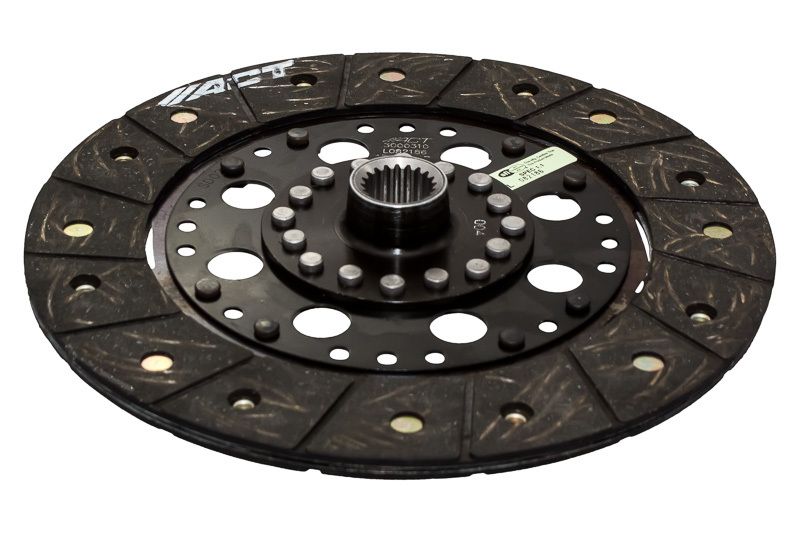 3000310 is a street rigid disc featuring premium organic materials with high copper content for better heat transfer and steel-backed lining for greater burst strength and durability. These discs are modified with reduced marcel for faster shift action to complement ACT pressure plates. The chrome-moly hub is heat-treated for strength and durability. Rivet design and materials are carefully selected for maximum strength. Lightweight, solid-hub design allows for quicker shifting and engagement. ACT's street rigid-hub discs provide race-proven performance with street manageability.